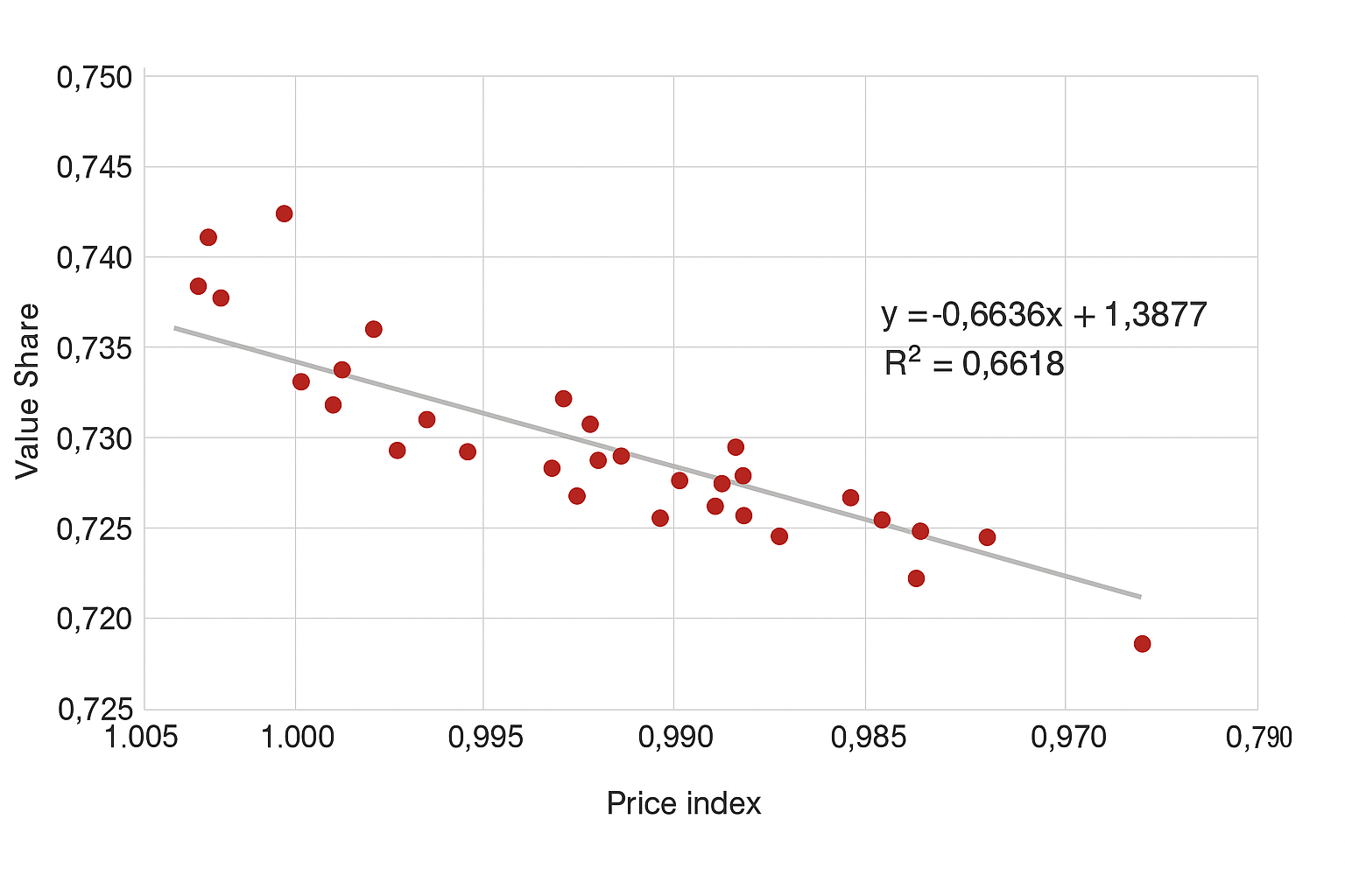 Market share recovery. Volume came back. And we saw a strong correlation (67%) between price sensitivity and performance.
